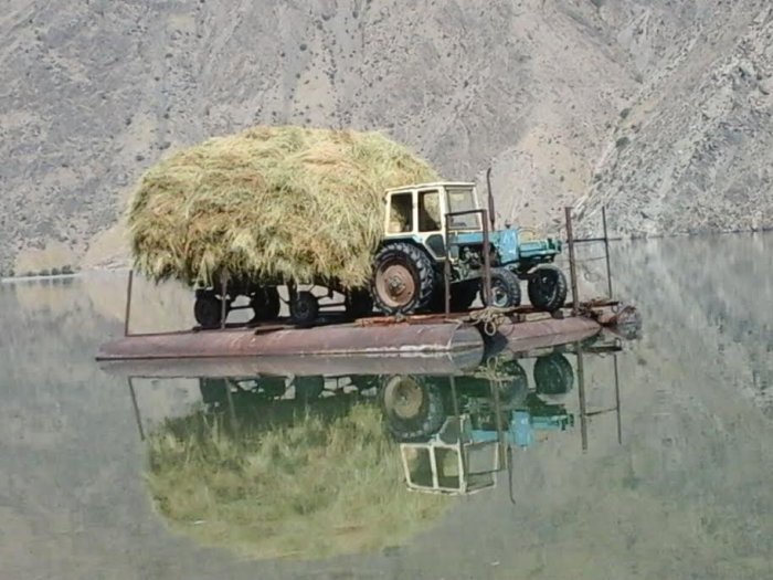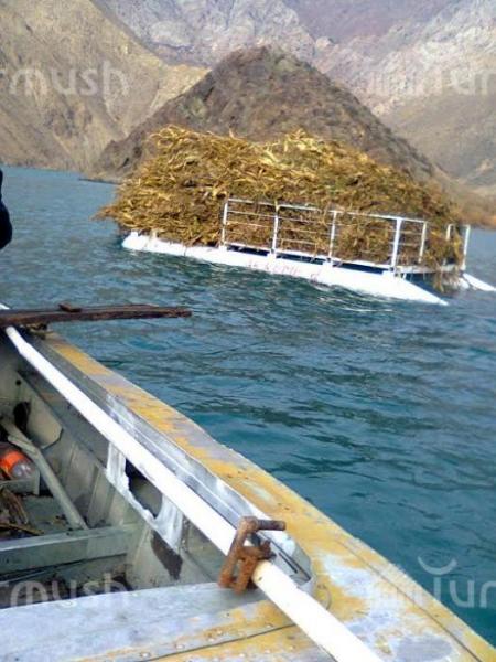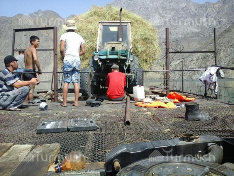 Айыл турмушу: Аксынын Кызыл-Бейит айылынын жашоочулары мал жандыктары үчүн тоюттарды кеме менен Нарын дарыясынан алып өтүшөт (фото)