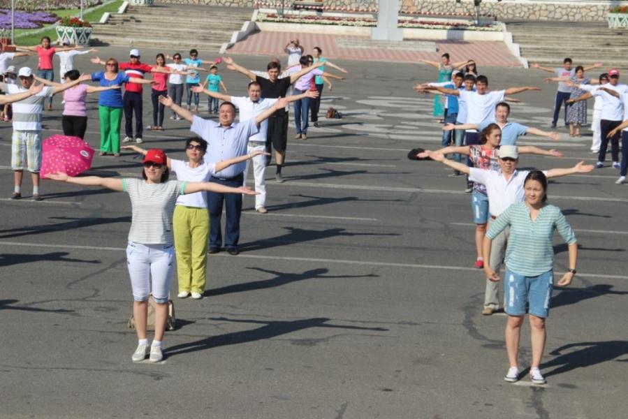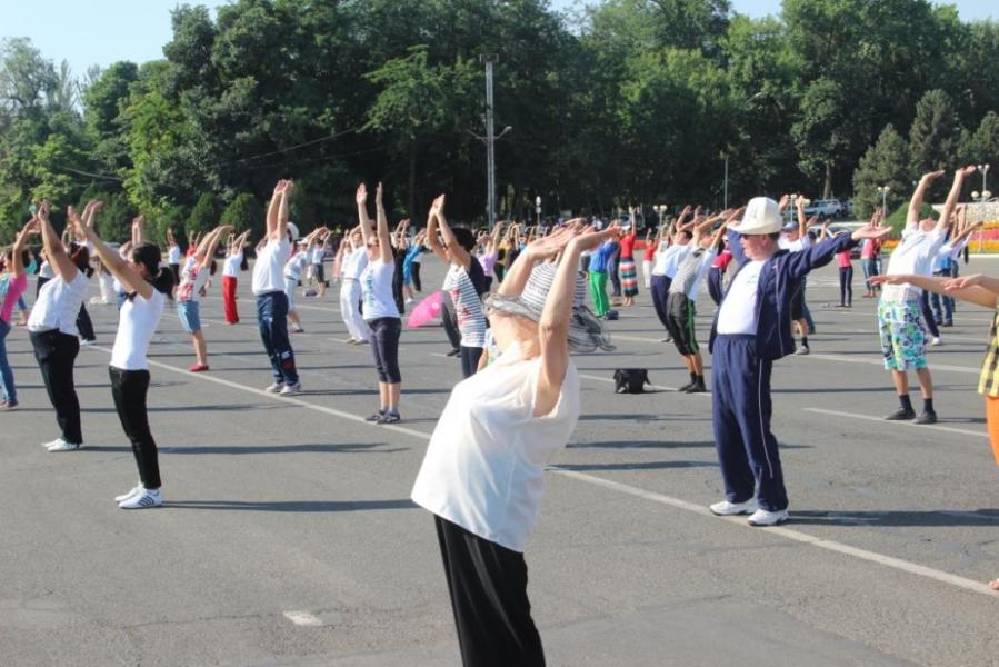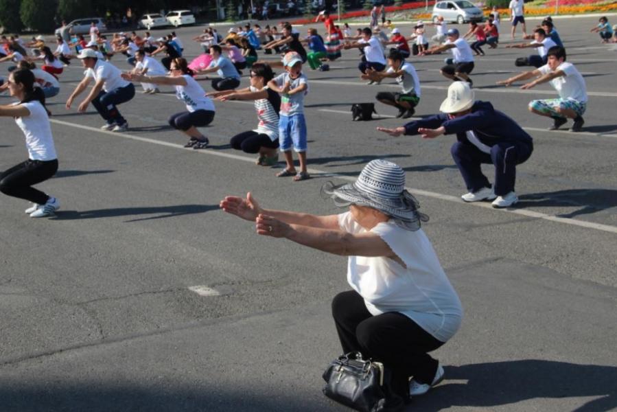 Фото - Ош шаарынын тургундары, маданият кызматкерлери жана медиктер борбордук аянтка чогулуп, таңкы көнүгүүлөрдү аткаруу менен «Кара жорго» бийин бийлешти