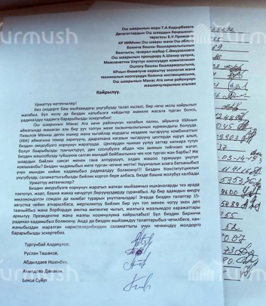 Оштогу Манас-Ата кичи районунун жашоочулары бийлик өкүлдөрүнө эскертүү беришти (фото)