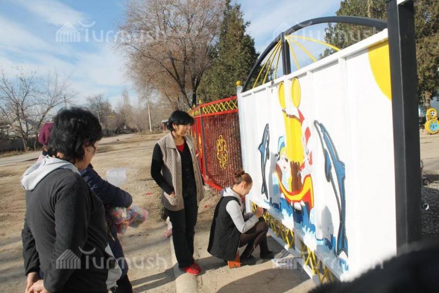 Токтогулдагы «Достук» бала бакчасынын короосу түстүү боёктер менен кооздолду (фото)