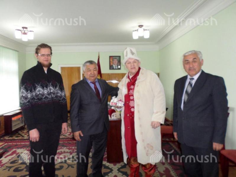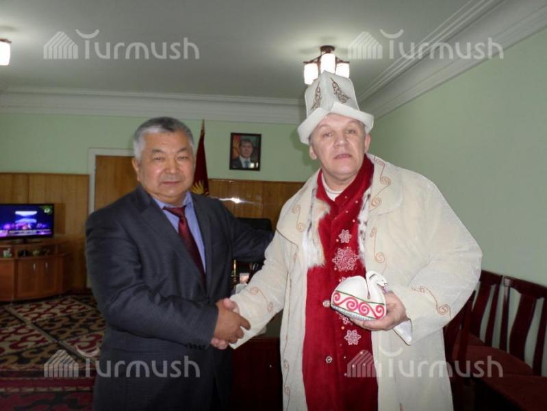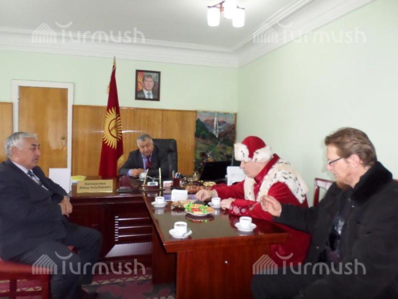 Кызыл-Кыя шаарынын мэри А.Халмурзаев Устюг шаарынан келген «Аяз атага» чапан жаап, калпак кийгизди (фото)