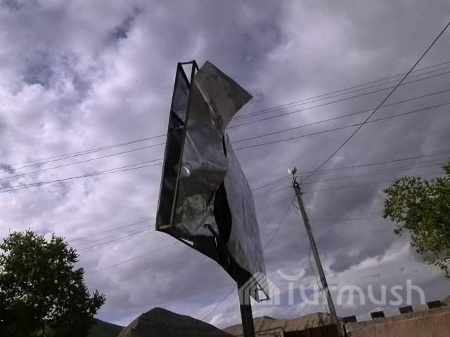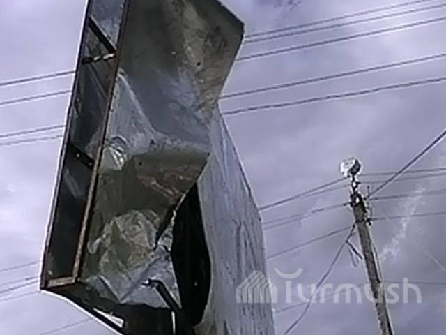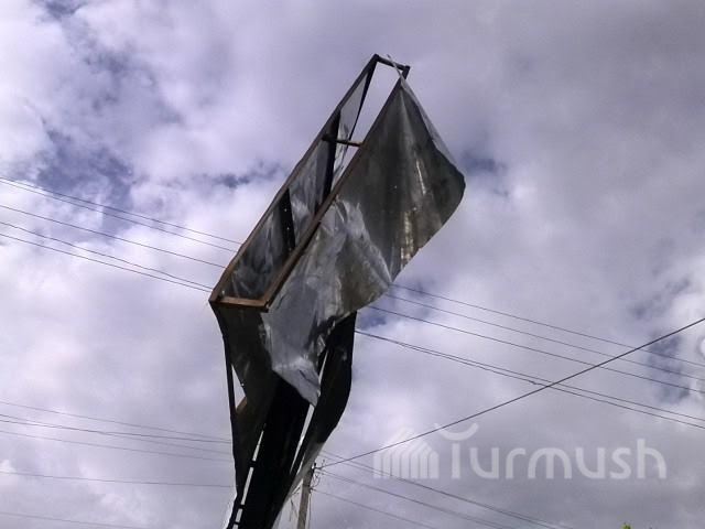 Нарын шаарындагы базардын жанына илинген жарнамалык такта кулап кала турган абалда турат (фото)