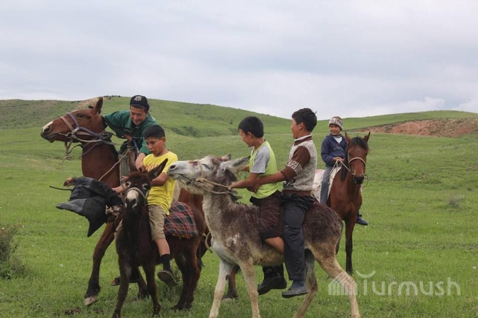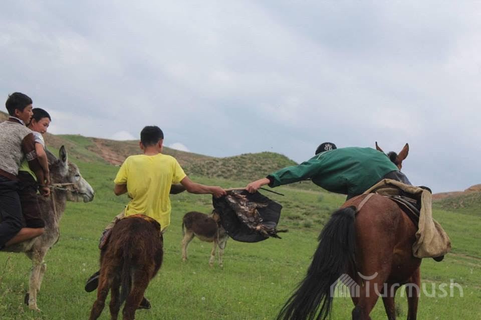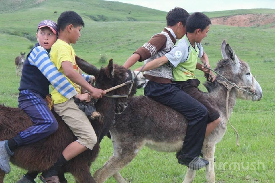 Аксынын Кара-Төбө айылында спорт аянтчасы жок болгондуктан балдар эшектер менен улак тартыш ойношот (фото)