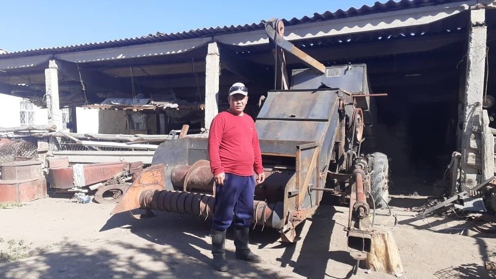 Айыл турмушу: 44 жаштагы Д.Молдалиев төө буурчак тазалоочу комбайн жасап жатат