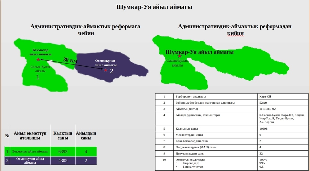 2024-жылы январь айында административдик-аймактык реформанын алкагында Бекмолдо жана Осмонкулов айыл аймактары бириктирилип, Сасык-Булак айылын административдик борбор деп аныктоо менен Шумкар-Уя айыл аймагы түзүлгөн.