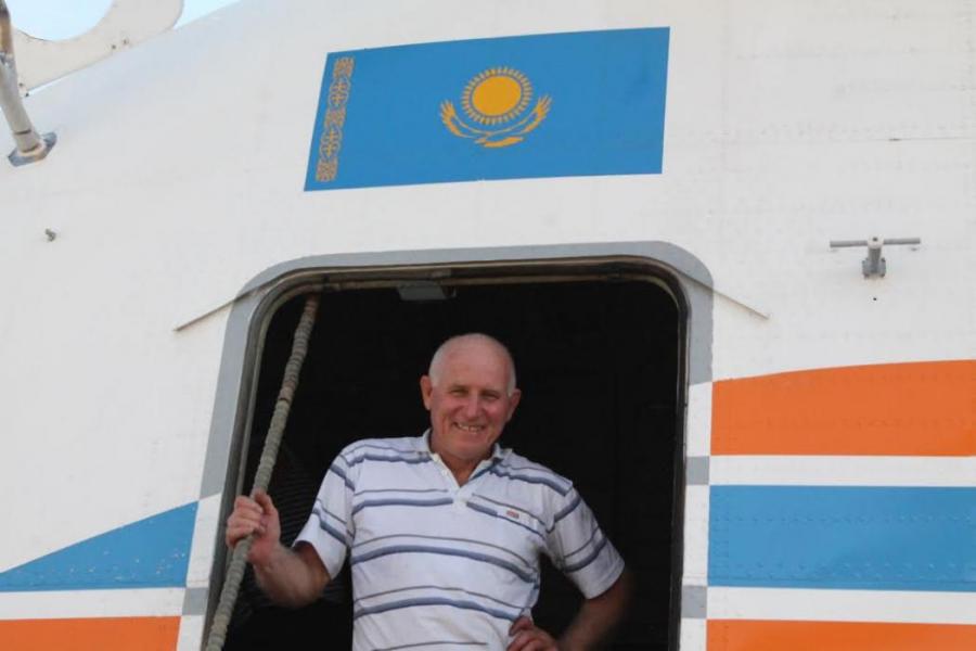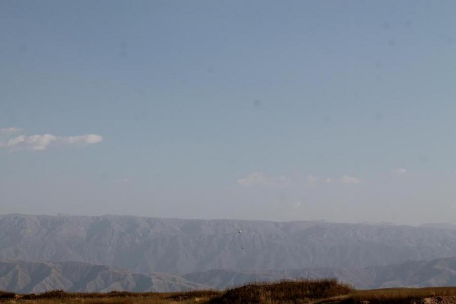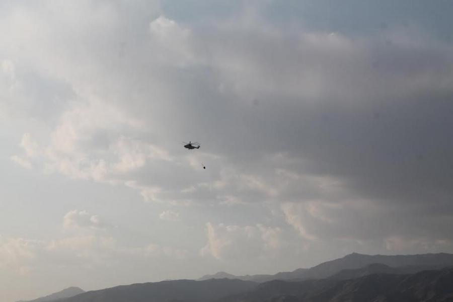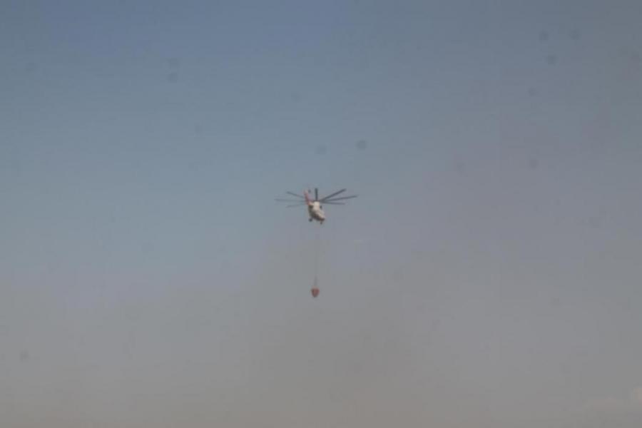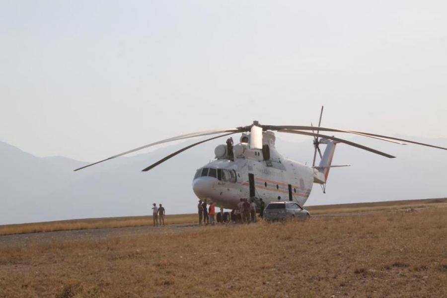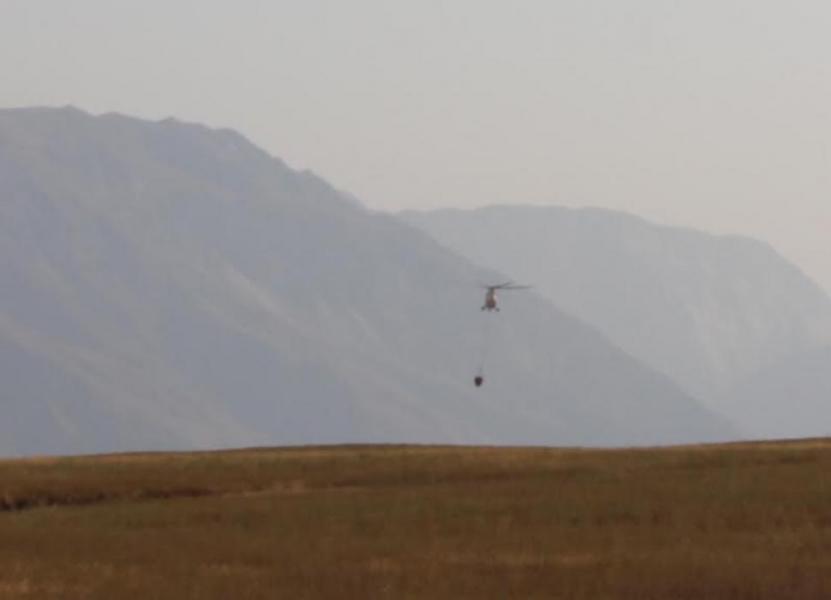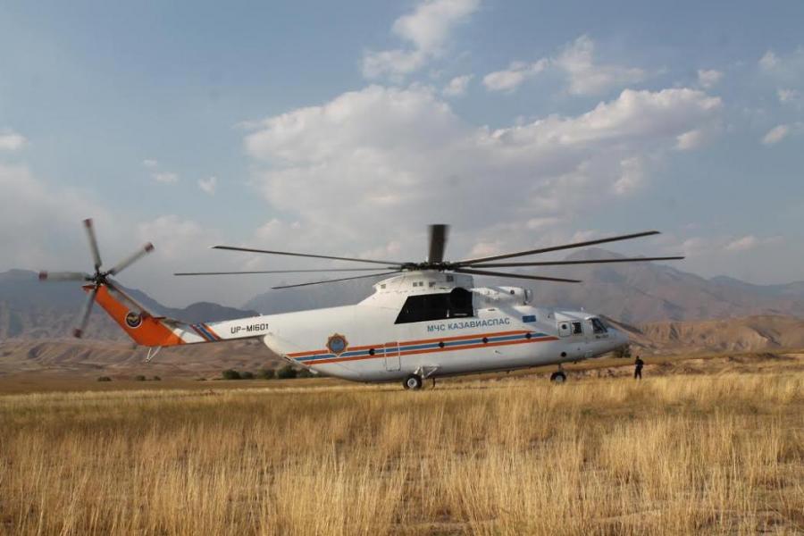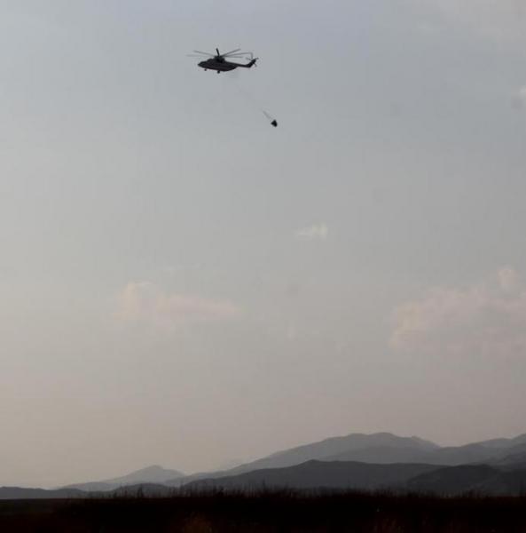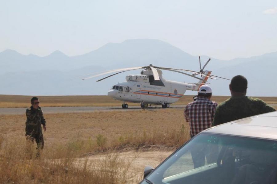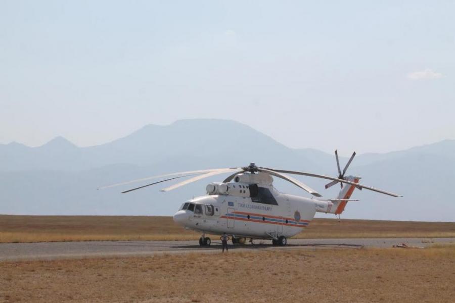 Фоторепортаж — Казахстанский вертолет МИ-26Т набирает воду для тушения пожара в ущелье Чычкан в Токтогульском водохранилище (видео)
