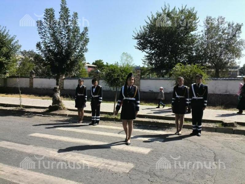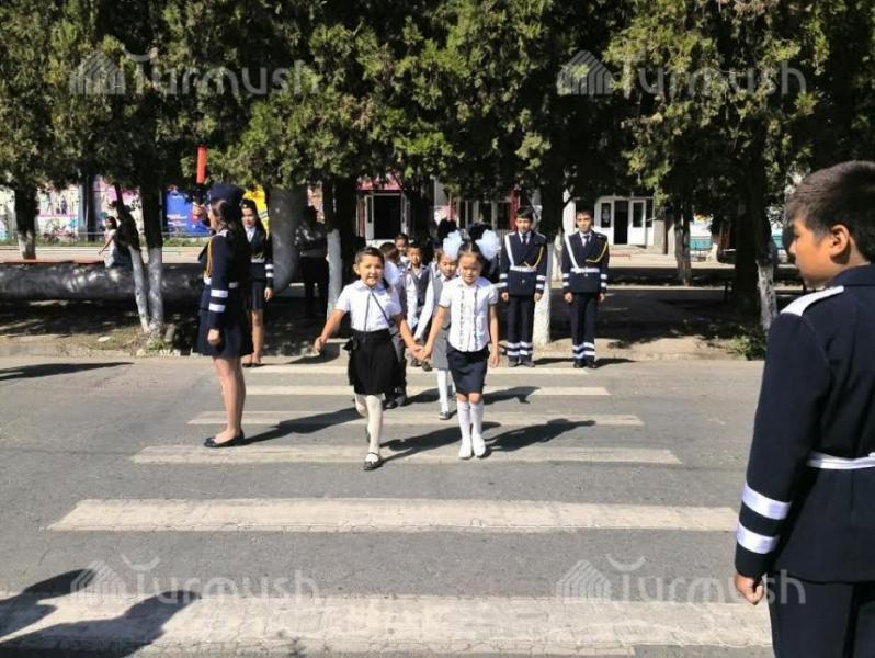 Фото — В Оше юные инспекторы помогают ученикам младших классов переходить дорогу