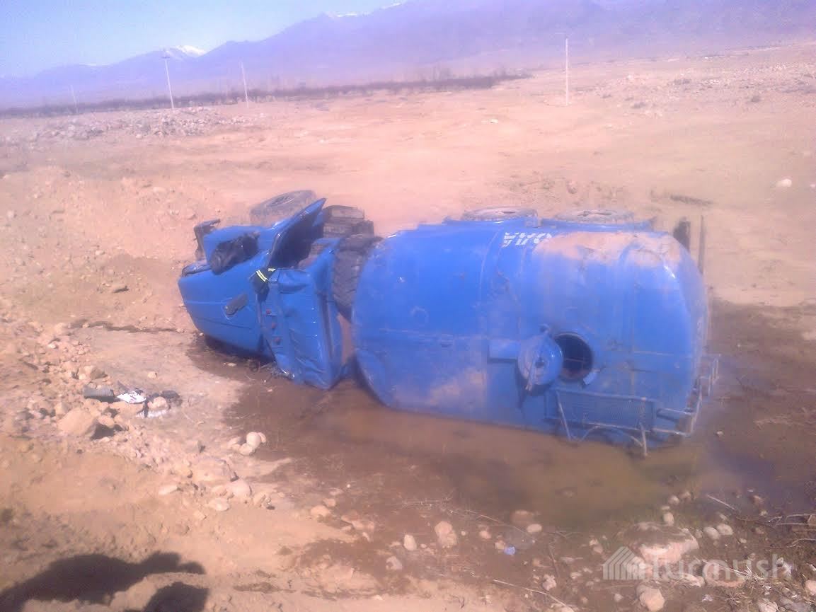 На Иссык-Куле опрокинулся грузовой автомобиль китайской компании «Лонг Хай», занимающейся реконструкцией дороги Тамчы—Чолпон-Ата—Корумду (фото)