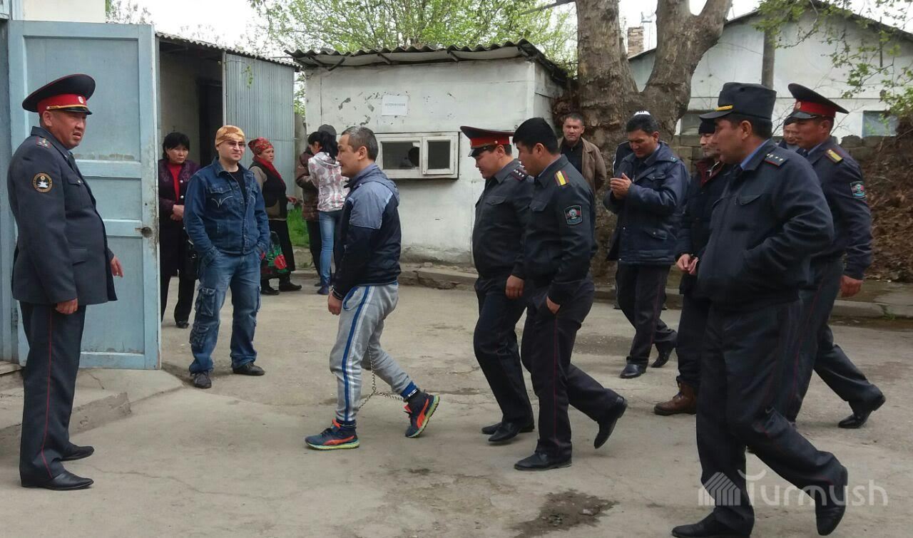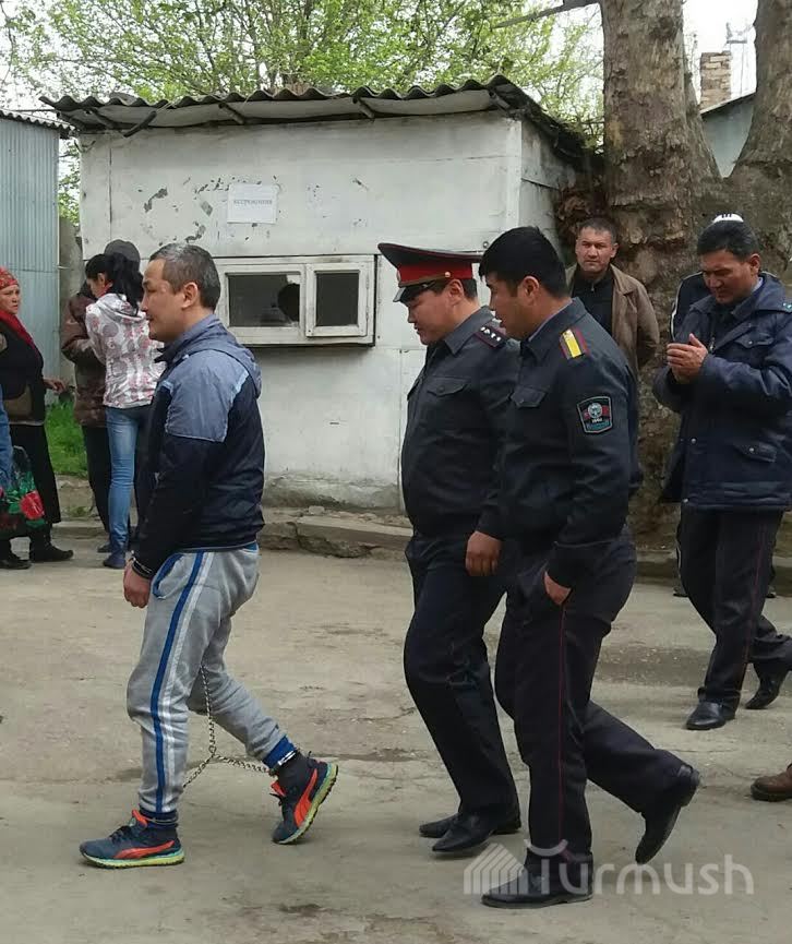 В Оше осужденного на пожизненный срок за разбойное нападение и убийство кассира «ЭкоИсламикБанка» привезли на заседание суда в наручниках на руках и ногах (фото)