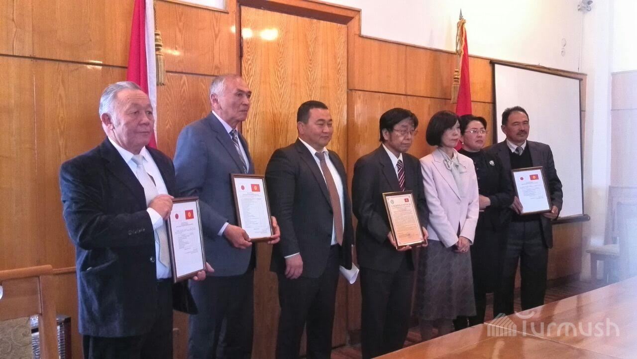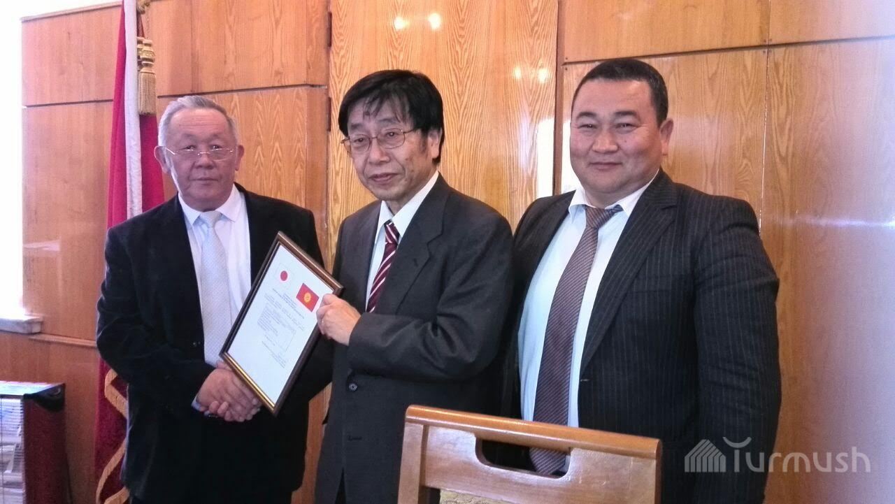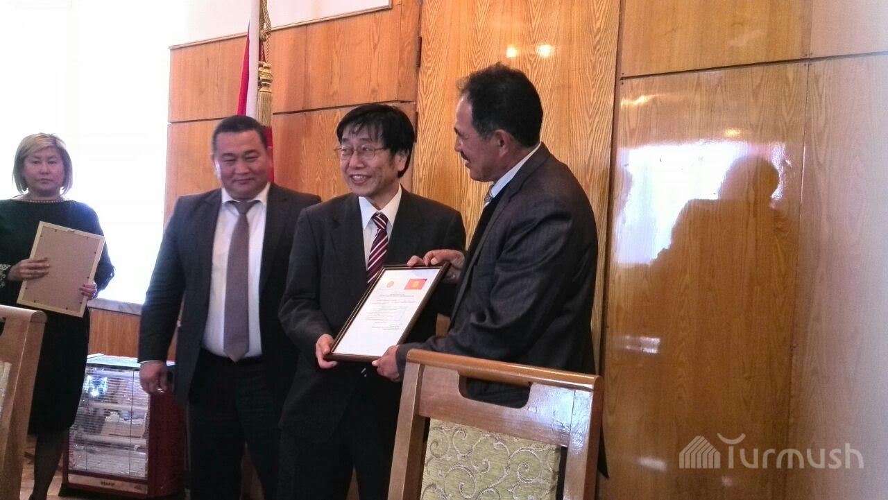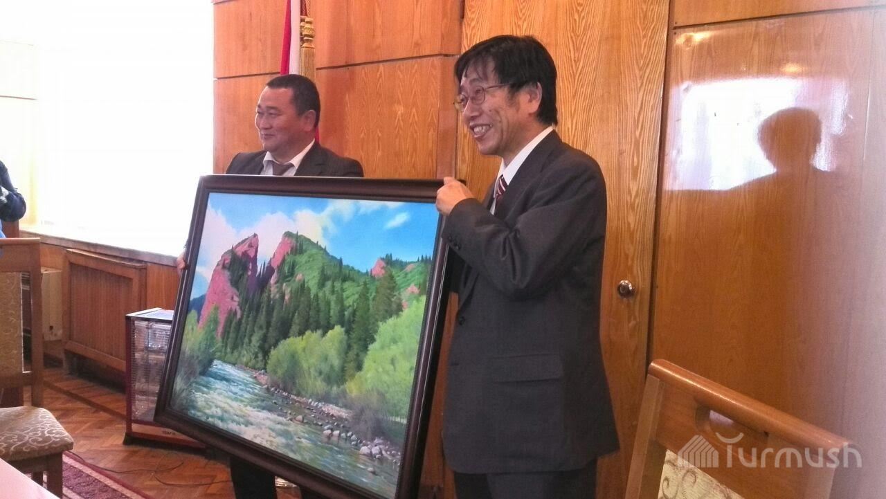 Послу Японии в КР Т.Коикэ, передавшему медучреждениям Иссык-Куля оборудование на $300 тыс., подарили картину «Жарылган жүрөк» (фото)