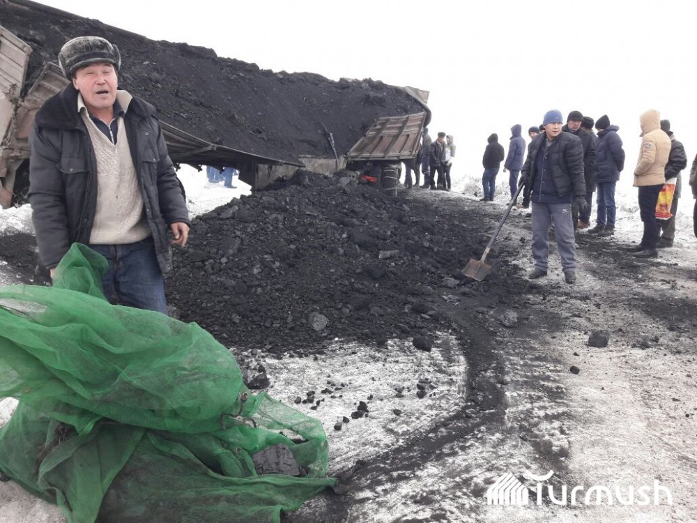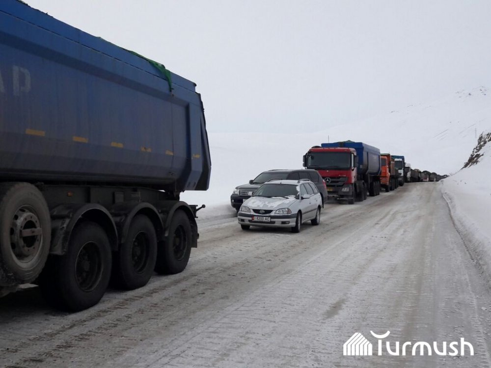 Фото — На перевале Кызарт в Нарыне перевернулся грузовик с углем, в пробке стоят около 50 машин