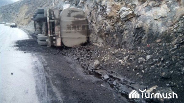Фото – На дороге Бишкек-Ош перевернулся 30-тонный бензовоз с мазутом, принадлежащий НПЗ «Джунда»