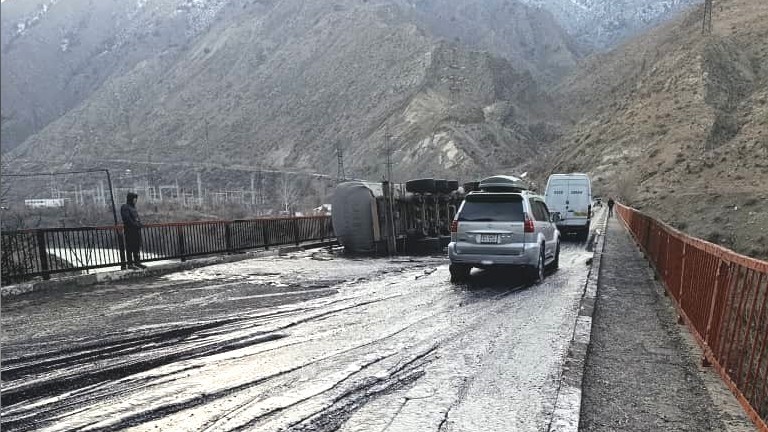 На мосту через реку Нарын по трассе Бишкек—Ош перевернулся бензовоз с мазутом — очевидцы отправили видео